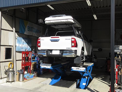 | トヨタ ハイラックス GUN125 をアライメント調整 業者様よりのご依頼 ジャオスのサスキットを付けられて 車高の調整とアライメント調整をいたしました。 ジャオスの車高調はネジ式だけど、脱着しないと 車高が変えられないから手間がかかります。 |