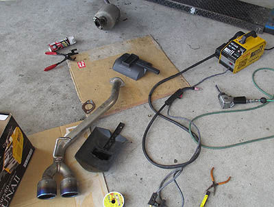 | 普段は行いませんが、緊急時の為に 簡単な溶接機も持っています。 お馴染みさんが、マフラーが折れたしまったので 急遽、溶接修理を行いました。 ついでに出口位置も変更して終了しました。 |